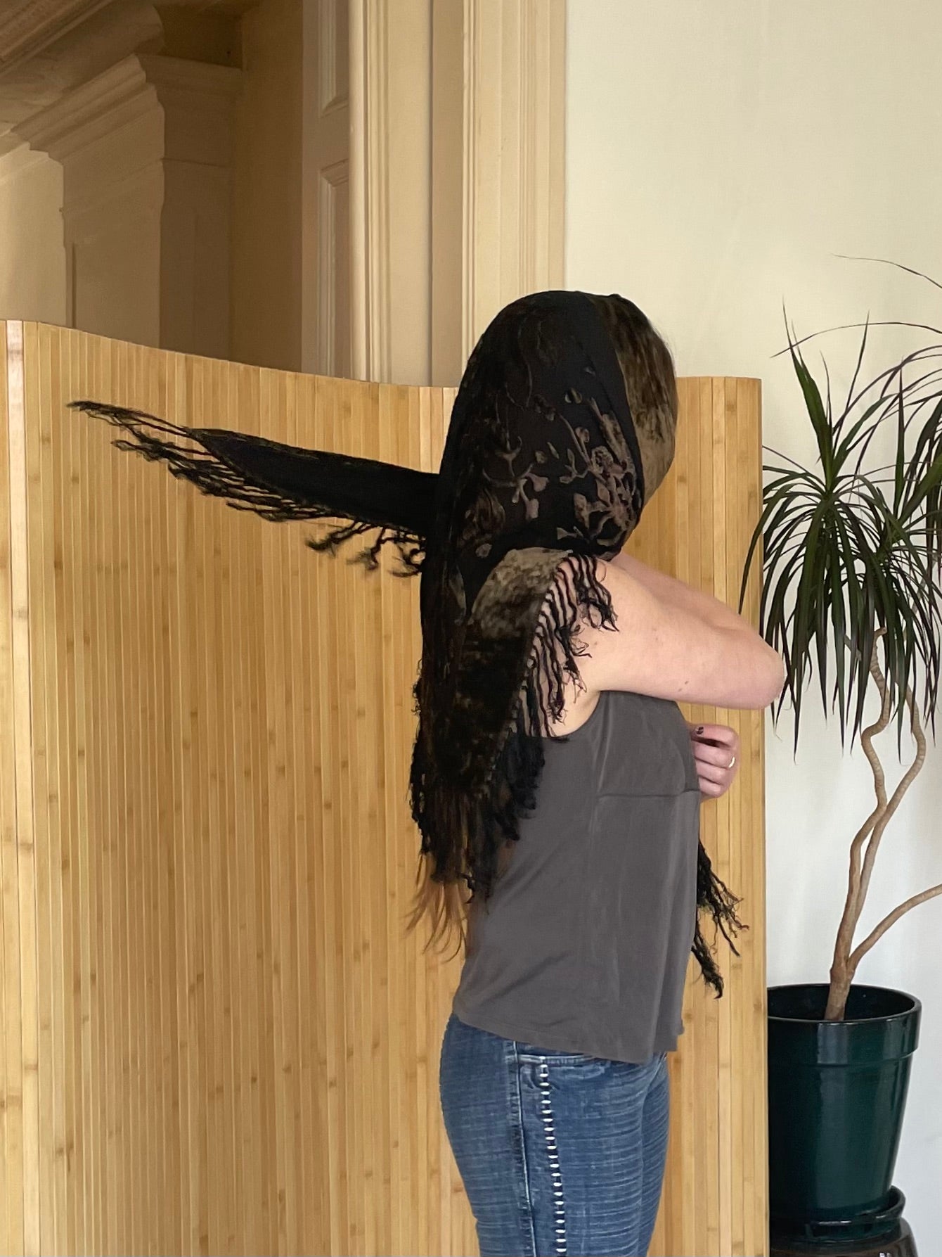 Absolute staple piece for a 90s witchy wardrobe. This is a triangular burnout velvet shawl with a beautiful floral/baroque devoré pattern. It has extra-long, silky fringe trim that gives it amazing movement.